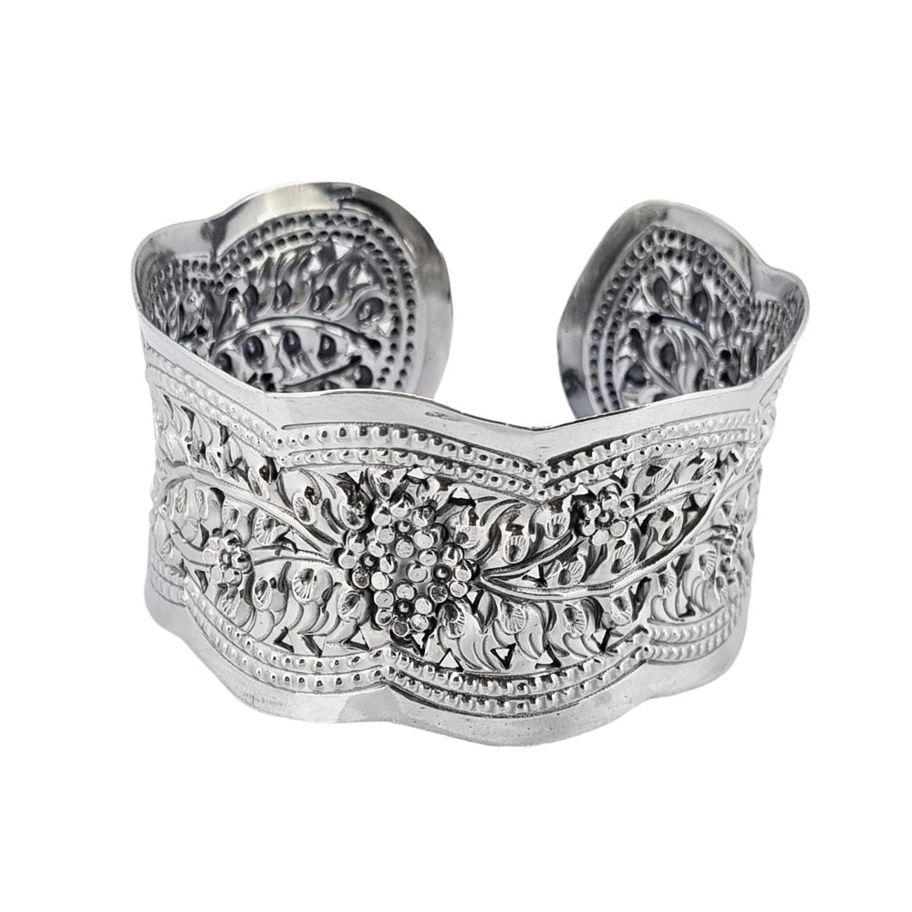 - Handcrafted 925 sterling silver with an open cuff design and unique floral pattern design which give this stylish bangle an arty look. High polished finish gives the bracelet beautiful shine.